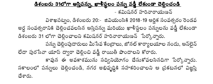 Citizens having dues for both House Tax and Vacant Land Tax can avoid further hike in interest of 2% if paid on or before 31st December 2018. |