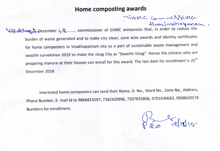 for home com-poster's in Visakhapatnam city as a part of sustainable waste management and swachh survekshan 2019 to make the vizag city as "swachh Vizag". |